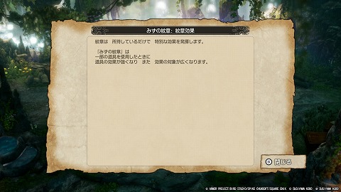 はかいの神父を倒すと、みずの紋章が手に入ります。みずの紋章を入手すると、道具の効果が強くなったり、効果の対象が広くなります。