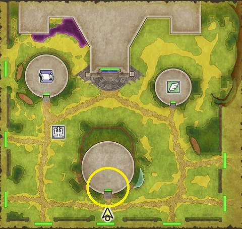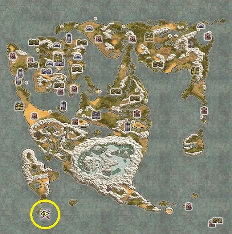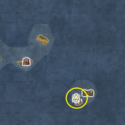 ザハンから東に進んで行くと、×印の場所に到着しました。大きい岩があるので、船で北側から近づくとAボタンで入ることができます。